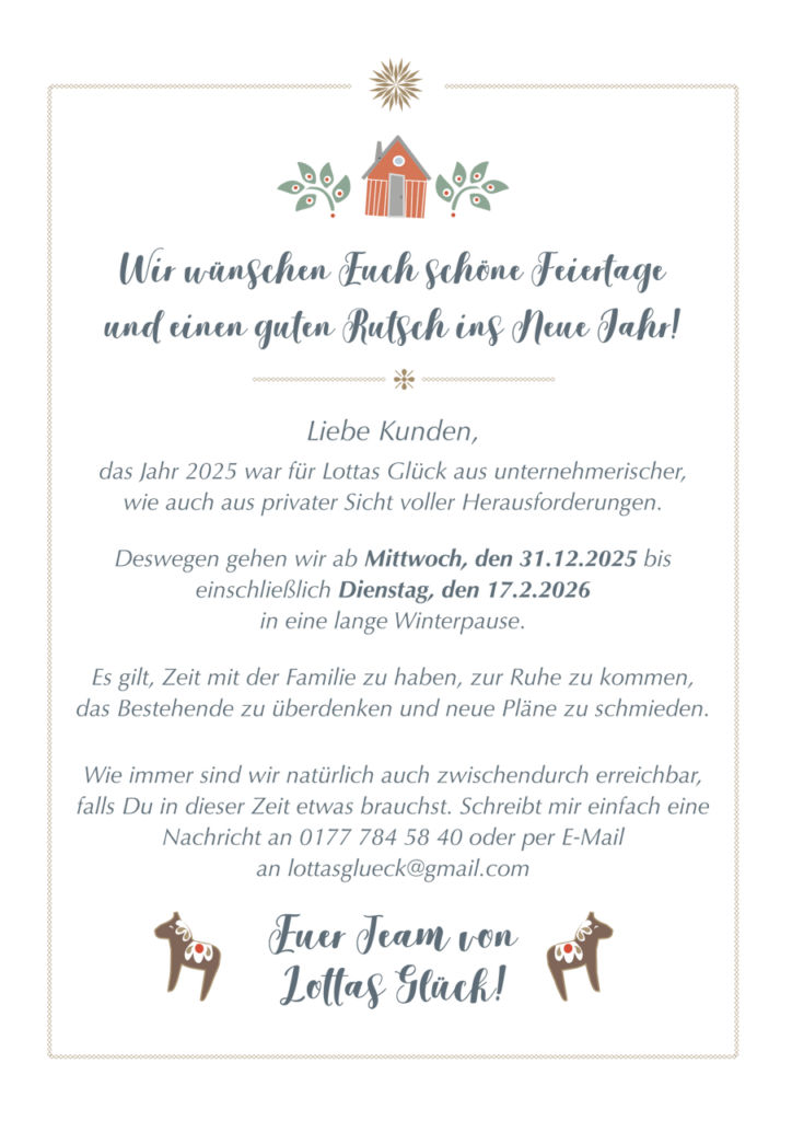 Du möchtest deinen Liebsten eine besondere Freude machen? Dann schenke ihnen doch einen Gutschein und lade sie ein, gemeinsam mit dir oder allein in aller Ruhe bei Lottas Glück nach neuen Lieblingsstücken zu suchen.